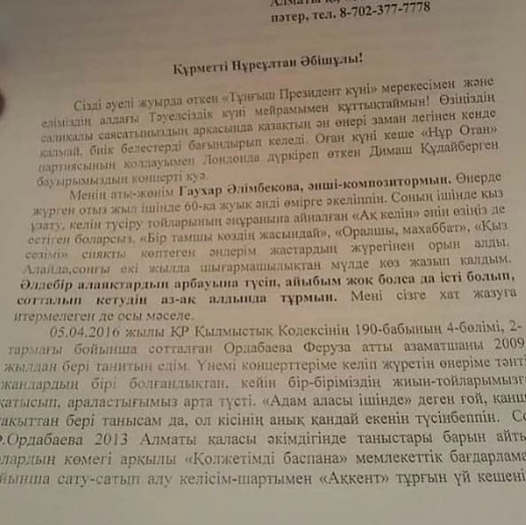 Гауһар Әлімбекова елбасыға хат жолдап, көмек сұраған