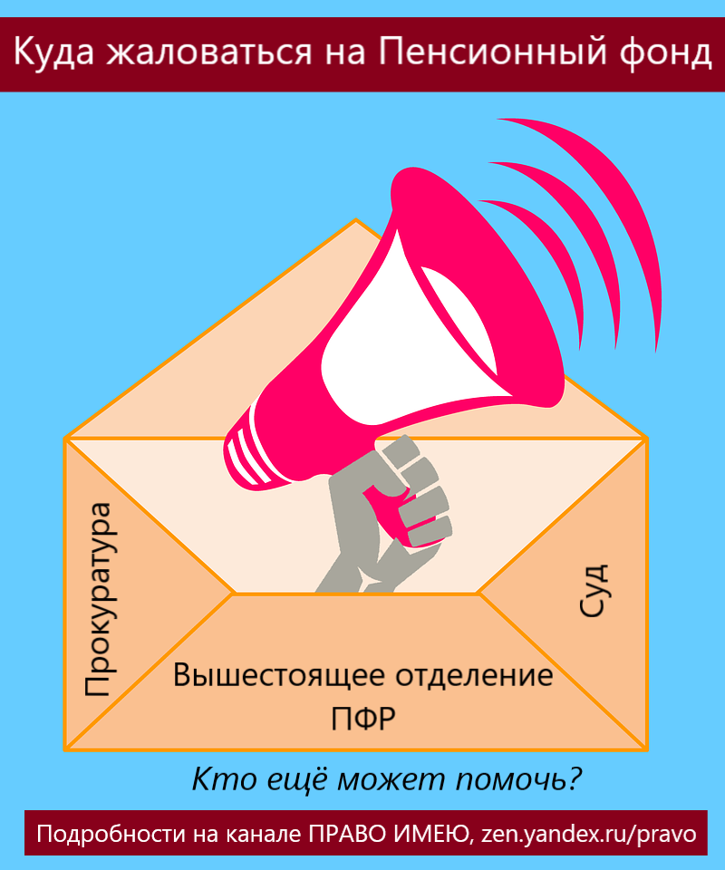 Если сотрудники Пенсионного фонда сказали вам «нет», это не значит, что они правы. Но даже если самый выдающийся юрист скажет вам «да» и заявит, что Пенсионный фонд, отказав вам, поступил не правильно – это просто слова, которые хоть и будут греть вашу душу, но не будут иметь практического значения. Мало только говорить и слушать – вы должны действовать. Отменяем решение Пенсионного фонда Канал ПРАВО ИМЕЮ разбирался, как действовать правильно, чтобы повлиять на решение Пенсионного фонда. Есть несколько этапов обжалования действий ПФР. Этап первый: обратиться с жалобой в вышестоящее отделение Пенсионного фонда Если вам отказали в районном (городском) отделении ПФР, то жалобу надо писать в региональное отделение ПФР. Они рассмотрят ваше обращение и пришлют официальный ответ на него. Если региональное отделение не на вашей стороне, тогда можно обратиться с жалобой в головное отделение Пенсионного фонда в Москву (все адреса есть в местном отделении ПФР). Сотрудники Пенсионного фонда обяза