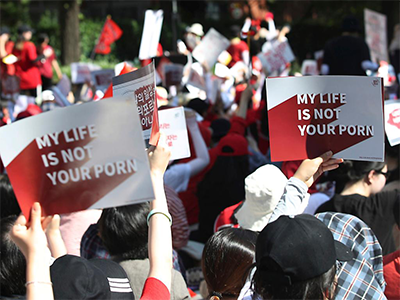 «Добро пожаловать в Сеул дорогая туристка! Место где ты можешь стать порно-звездой!» - гласила надпись на плакате, в руках одной из тысяч кореянок сидящих на проезжей части. Окруженные ограждением и полицейскими несчастные феминистки выкрикивали смешные лозунги единым многотысячным голосом.