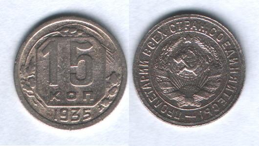 Не так давно в Петербурге была обнаружена одна из редчайших советских монет - 15 копеек 1935 года с лицевой стороной 1931-1934 годов и оборотной стороной 1935 года.