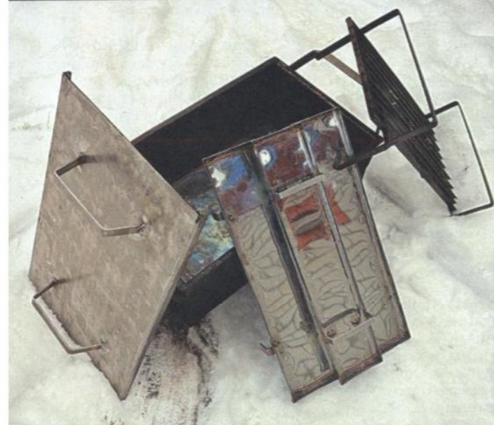 Задумка изготовить коптильню для горячего копчения в виде вкладыша в дворовый мангал появилась давно, но никак не мог найти нержавеющий материал на все детали... Но тут на моей основной работе закрыли участок гальванических покрытий, демонтировали короба вентиляции. Короба те были сварены еще в советские времена из листов пищевой 2 - миллиметровой нержавейки. Отличный материал для ящика и крышки коптильни. На решетку и поддон взял полоски листовой нержавейки потоньше - миллиметровку. Решетка оригинальна тем, что оснащена ручками и ножками. Очень удобно готовое копченое блюдо переносить и ставить прямо на обеденный стол. Поддон, сваренный из трех одинаковых лотков, задуман для сбора капель жира и легко пропускает горячие дымовые газы. Он также имеет ручки и ножки. Для создания ящика я вырезал по размеру листы для корпуса и двух стенок, загнул их по линии днища и отбортовки, приварил боковины к корпусу, дополнил отбортовку вставками 12х12 мм по углам. Затем изготовил и приварил