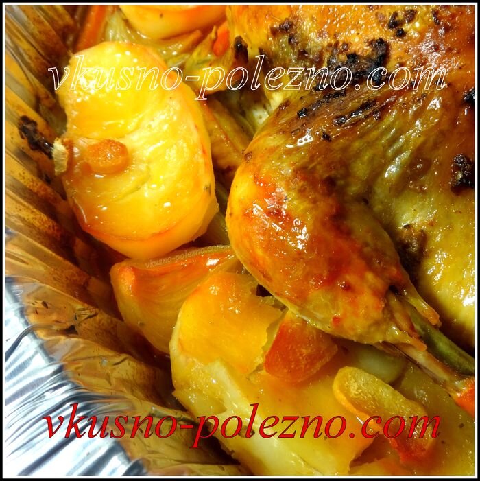 Курица получилась замечательная! А наши гости даже сказали, что лучшим комплиментом для курицы,- была картошка. (Игра слов: слово «комплимент», изначально, значило как «дополнение», или «последний штрих к портрету».