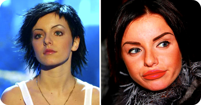 Юлия Волкова бывшая солистка группы "Тату." Юля увеличила губы. Сделала себе "карикатурные брови" ,которые пришлось исправлять и после родов увеличила бюст.