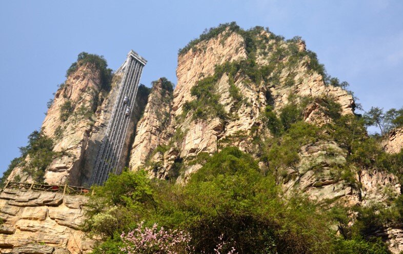 Лифт Байлонг или его еще называют «Лифт сотен драконов» находится Улинъюань в Чжанцзяцзе, одним из самых живописных районов, который также является одним из объектов мирового природного наследия в Китае. По всем возможным техническим характеристикам этот лифт: самый высокий; самый большой; с самой максимальной нагрузкой; самый быстрый в мире. Лифт Байлонг входит в число 11 лучших креативных лифтов. Сооружение просто потрясающее. Общая высота составляет 335 метров, из которых 154 метра находится в горных скважинах, а остальные 172 метра состоят из стальной вышки и других компонентов. Лифт включает в себя три смотровых лифта, работающие параллельно. Каждый лифт состоит из двух этажей и может принять 50 пассажиров одновременно, скорость составляет 3 м в секунду, а с 2013 года скорость увеличили еще больше и теперь это 5 м в секунду. Представляете себе подняться на 360 метров всего за одну минуту? При одновременной работе трех лифтов, количество пассажиров в одну сторону достигнет 4 0