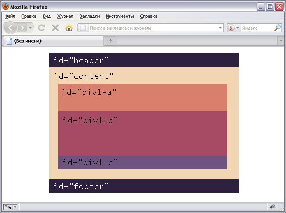Обратите внимание, что на этот раз, поскольку блок #div-1a был удален из документа, оставшиеся элементы на странице расположились по-другому: #div-1b, #div-1c и #footer переместились выше, на место удаленного блока. А сам блок #div-1a, расположился точно в правом, верхнему углу страницы.