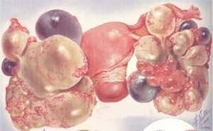 киста имеет ровную поверхность и гладкие стенки. Размер колеблется от 1,5 см до 35 см в диаметре. Внутри содержится жидкость желтого цвета. Образование размером до 3 см не мешает оплодотворению, однако как поведет себя киста во время беременности неизвестно. Так или иначе, опасность существует и лечение обязательно; папиллярная (сосочковая) – внутренние стенки кисты покрыты многочисленными сосочками разной формы. Внутри содержится жидкость прозрачного или коричневого цвета. Грубососочковая цистаденома яичника в 50% случаев перерастает в злокачественную. Имеет многокамерный и однокамерный тип, т.е. может содержать несколько полостей. Зачастую появляется сразу на двух яичниках. Пограничная папиллярная цистаденома отличается большим количеством сосочков, которые своим видом напоминают бородавки.