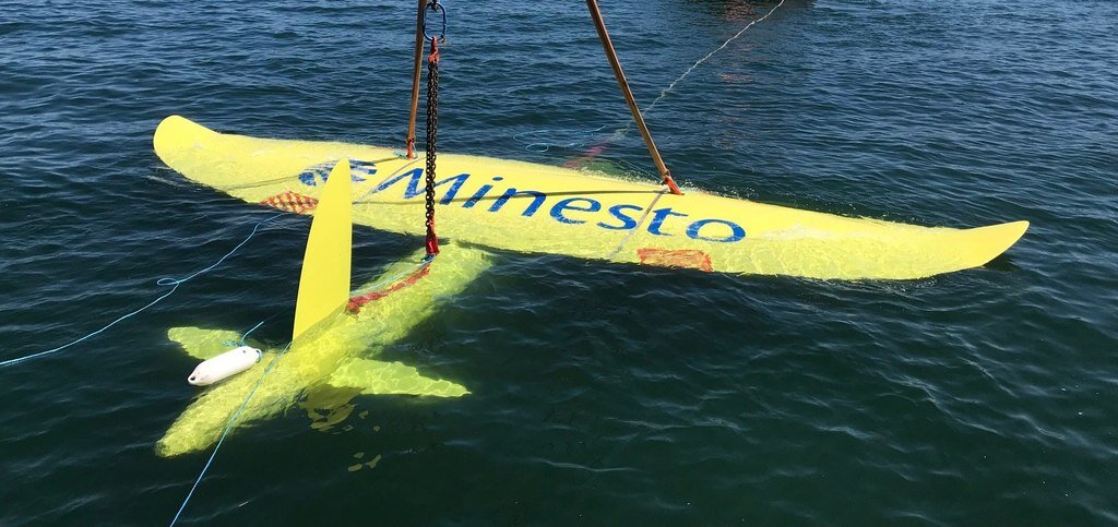 Шведская компания Minesto успешно испытала прототип подводного генератора, способного эффективно извлекать энергию из медленных (1,2-2,4 м/с) морских течений и приливных потоков. Генератор Minesto DG500 можно смело назвать подводным змеем: будучи привязан ко дну тросом, он описывает под водой восьмёрки таким же образом, как воздушный змей компании Makani Power (см. «Энерговектор», № 12/2013, с. 10). Благодаря эффекту скольжения поперёк потока скорость движения подводного крыла относительно воды в десять раз превышает скорость течения. Для преобразования кинетической энергии движения в электрическую на крыле подводного змея установлены электрический генератор с винтом. По словам руководителя компании Мартина Эдлунда, никакая другая технология не позволяет построить окупаемую энергоустановку для медленных течений. Первые испытания прототипа проведены на северо-западе Уэльса, неподалёку от о. Холихед. Генератор получил название Barcud Gwyrdd, что в переводе с уэльского означает «Зелёный з