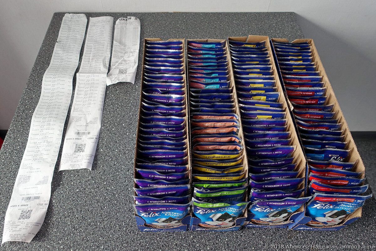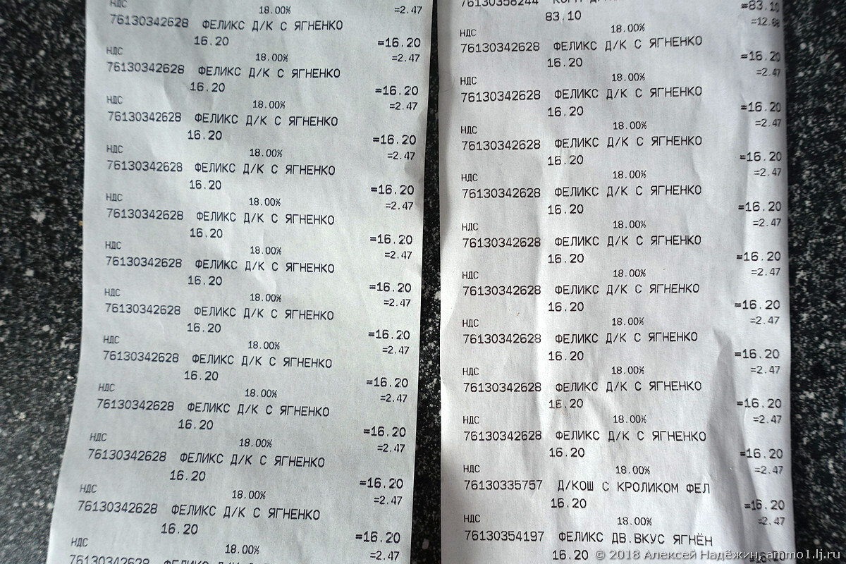 Недавно покупал в Атаке кошачий корм по акции. Кассир взяла один пакетик и сканировала с него штрих-код сорок пять раз подряд. Получился длиннющий чек, из которого невозможно понять, сколько пакетов корма пробито, и нет ли ошибки (не буду же я считать строчки).