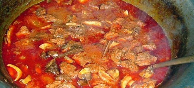 Бограч-гуляш – традиционно венгерское блюдо. Поэтому, нет ничего странного в том, что оно так хорошо прижилось и на Закарпатье. Закарпатский бограч – это гуляш, который готовится чаще всего над костром на природе, в окружении веселой компании Залог вкусного бограча – это хорошее мясо. Родственным блюду является говядина. Но, люди склонны экспериментировать в поисках идеала. Кулинарные умельцы Закарпатья делают бограч из любого мяса, у каждого района а иногда и села, свои рецепты. Мясо может быть как на кости, так и без, а лучше всего подходят рёбрышки. На венгерском «бограч» или «bogrács» означает «котелок». Поэтому, чистите котелок и пусть у вас все получится. Для бограча вам понадобится: сало – 200 гр.; мясо – 3 кг.; картофель – 3 кг.; морковь – 4 шт.; лук репчатый – 4 шт.; чеснок – 2 зубчика; чёрный молотый перец — 1 ч. л.; красный молотый перец – 2 ст. л.; помидоры – 500 гр.; болгарский перец (паприка) — 300 гр.; соль, тмин, петрушка, лавровый лист, зелень – по вкусу. Приготовление