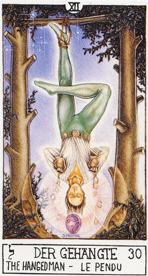 Аркан "Повешенный" указывает на вялотекущий кризис в отношениях. Очень часто в раскладе дополнительную окраску Аркану придают сопутствующие Арканы: 5 пентаклей: — переживание кризиса, совместное страдание, но уверенное нежелание расстаться, желание пройти этот путь вместе; — подчеркивание невозможности общаться друг с другом; — один пользуется другим; — потеря любви, необходимость оказать другому партнеру помощь, поделиться любовью, которой так не хватает другому. 10 жезлов: — партнер взял на себя те обязанности, что выполнить не может; — подчеркивает, что партнеры сами приняли на себя роль жертвы в отношениях и тащат этот крест на себе как мученики; — партнеры не видят перспективы отношений, но чувствуют свою вину и не отказываются от отношений; — действия мотивированы комплексами и страхами. Партнер боялся/боится быть плохим в глазах других (родственников, друзей, знакомых, самого партнера), боится стать ненужным любимому человеку, боится остаться один (см. окружающие карты).