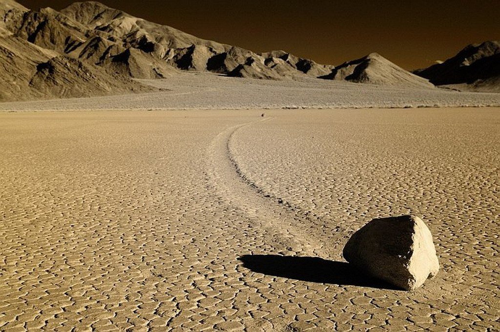 Интересный феномен. Камни в Долине Смерти, двигаются сами по себе. На данный момент учёные не смогли зафиксировать передвижение камней на камеру, однако следы, которые оставляют камни, вызывают вопросы у каждого кто это увидит. Ещё и название места такое ужасное - Долина Смерти. Данный феномен заметили на засохшей реке Рейстрэк-Плайя, в Долине Смерти. Само мистическое место Долина Смерти привлекает к себе много внимания, а ещё и движение камней и вовсе привлекло всё большее количество туристов. Камни двигаются самопроизвольно, они могут менять направление, не двигаться какое-то время, или вовсе исчезнуть. Известны случаи, когда след есть, а булыжника нет. С чем это всё связано, неизвестно. Учёные выдвигают свои теории, но опровергнуть или подтвердить их пока что никто не смог. Учёные также выдвигали теории, связанные с тем, что камни передвигает ледяная корка которая образуется зимой. Но последующие исследования показали, что лёд и ветер никак не влияют на камни. Также, размер и вес к