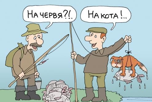 - А почему нам не наливаете?!.. *** Сидит рыбак на берегу речки. У него две удочки. На одну он нанизывает червяка и бросает в речку. На другую тоже нанизывает червяка, но бросает сзади себя.