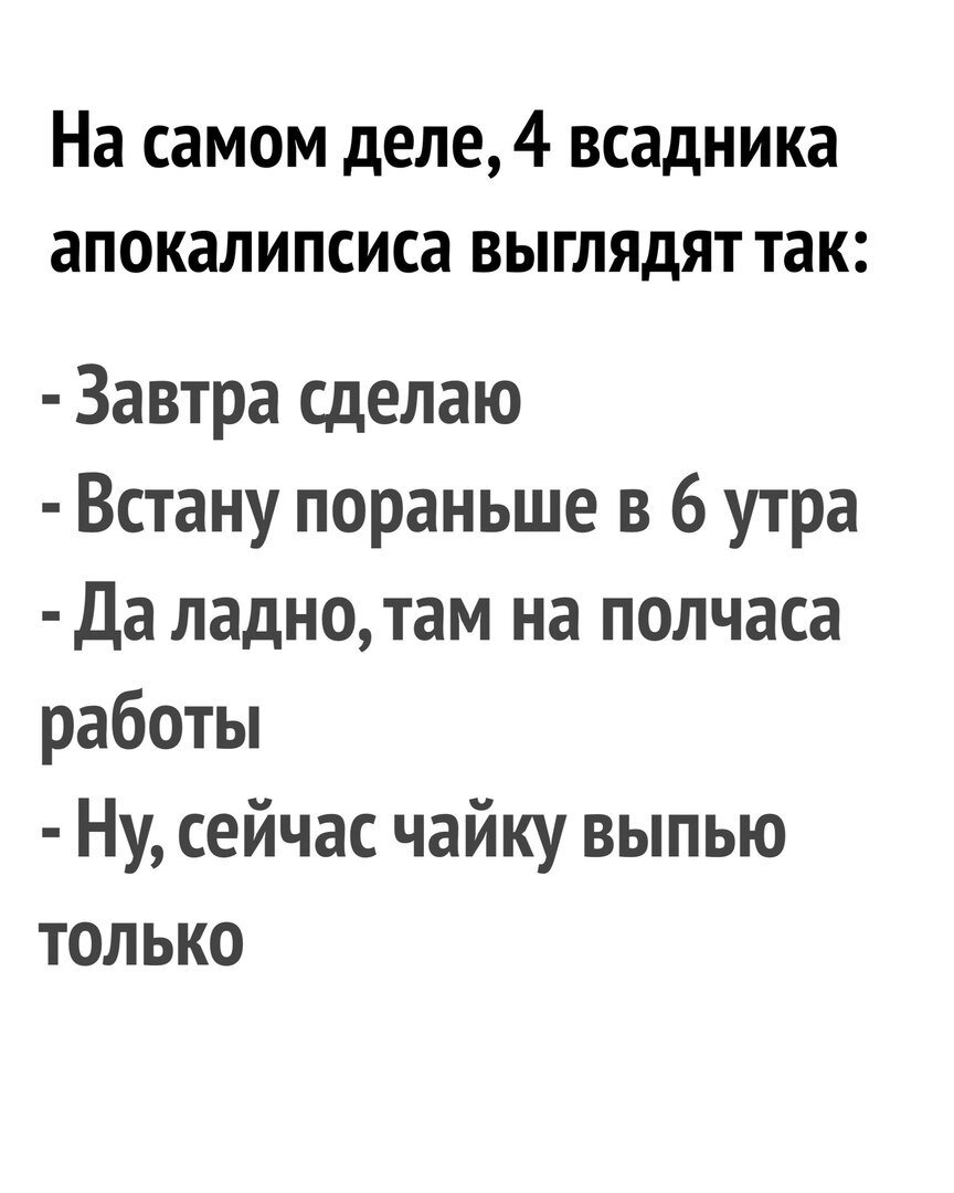 Методов обмана может быть несколько: если у вас постоянный заказчик/работодатель, которому вы дороги, попробуйте настропалить его, чтобы давал все задачи как более-менее срочные, даже если на самом деле они не горят. Если так не работает, создавайте искусственные дедлайны для себя сами. Мозг, конечно, может шутки не понять и не оценить – но если хотя бы немного поможет, уже хорошо. Например, я говорю себе: «Если сегодня не поделюсь с вами статьей, это будет просто катастрофа. Публикаций давно не было, так что это будет катастрофа вселенского масштаба!». Даже если на самом деле ничего в этом высказывании не соответствует действительности, оно постепенно укореняется в мозгу и начинает давить на подсознание: «Пиши! Пиши! Пиши!».