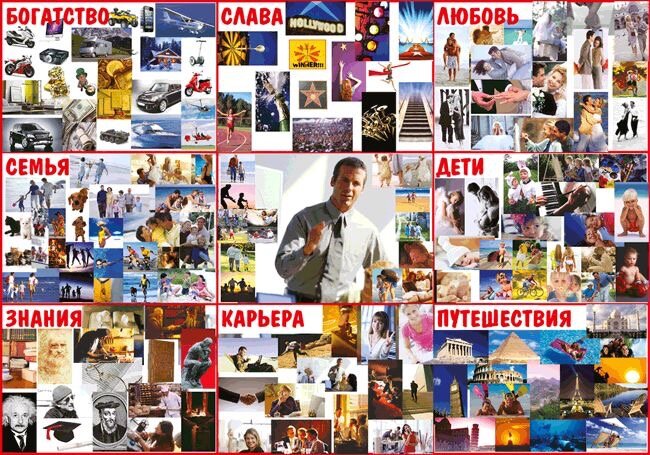 Перед выбором картинок и составлением желаний хочу дать вам совет: поместите в каждый блок желание, которое вам легко и просто осуществить. Или такое, которое уже вот-вот сбудется. Тем самым вы создадите цепочку, исполнения желаний. Ваше подсознание получит дополнительную уверенность в том, что мечты ваши исполняются легко и быстро.