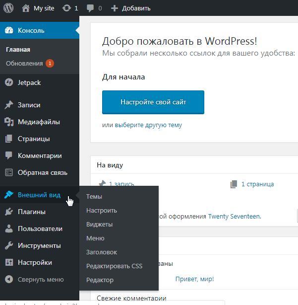 Итак друзья, мы с вами наконец создали интернет-сайт. Это равносильно "Прорубить окно в Европу" в Петровские времена. Сейчас мы приоткрыли для себя возможность неограниченной творческой деятельности. Теперь переходим к наполнению его полезным контентом. То есть, перешли в стадию окормления созданного сайта, придания ему приятного, притягательного вида и наполнения востребованным уникальным контентом. Рассмотрим, что из себя представляет Вордпресс и как используя его управлять сайтом. Но, прежде, перечислю преимущества CMS WordPress. Помимо возможности бесплатной установки, он имеет уникальную особенность удовлетворить интересы и запросы вебмастеров по созданию блогов, интернет-магазинов, корпоративных сайтов, информационных порталов. Владельцам ресурсов на WordPress доступны множественные бесплатные шаблоны и плагины, улучшающие функциональность работы сайта. Если вы внимательно посмотрите картинку административной панели, то даже на интуитивном уровне всё понятно - просто надо кликнут