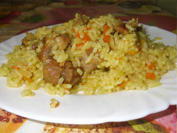 Плов является одним из древнейших традиционных блюд для стран Средней Азии и Ближнего Востока. Он состоит всего из двух основных компонентов – мяса и риса. Чаще всего его готовят с говядиной или бараниной. Но и со свининой он получается очень вкусный. Нам потребуется: 400 г. свинины 1 средняя морковка 1 стакан риса 4 зубчика чеснока приправы для плова соль и перец по вкусу Приступаем: 1)Чистим овощи. Крупно нарезаем морковь, лук - небольшими кубиками. Рис сначала несколько раз промываем в проточной воде, потом заливаем и даем настояться 10-15 минут. После чего сливаем воду. 2) Нарезаем свинину небольшими кубиками. Разогреваем на сильном огне сковороду с подсолнечным маслом, выкладываем свинину и обжариваем до золотистой корочки. Если мясо начнет давать сок, аккуратно сливаем лишнюю жидкость и продолжаем обжаривать. После появления золотистой корочки, ставим на средний огонь и добавляем лук и морковь. Возможно понадобится подлить немного еще немного масла. Жарим овощи до полуготовно