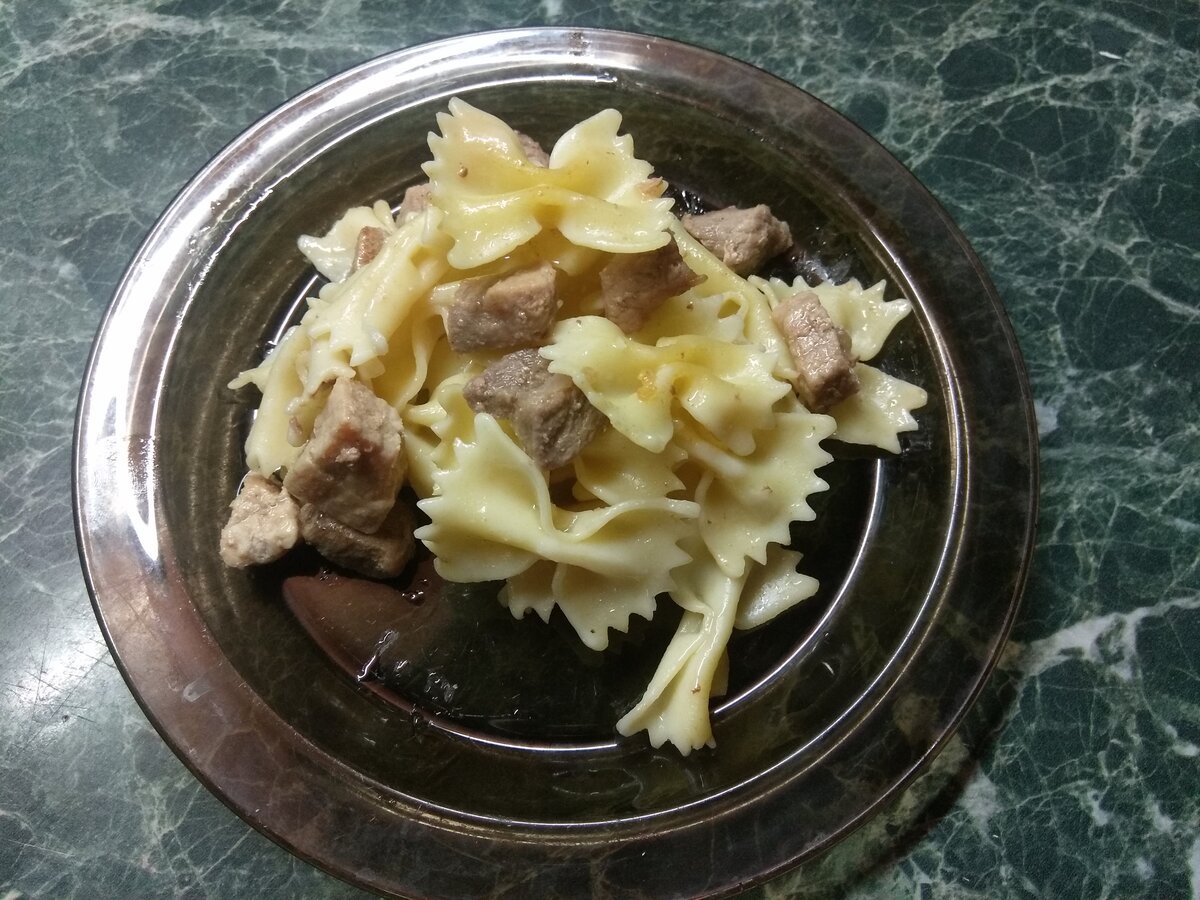 Это некая интерпретация макарон «по-флотски», только с одним существенным различием: вместо фарша я кладу в блюдо кусочки свинины. Можно пустить и любое другое мясо: хоть говядину, хоть курятну, разницы нет. Готовится быстро, еще быстрее съедается. Пойдет в качестве второго блюда на обед, или на ужин. Этот рецепт придет на помощь, когда вам надо быстро, сытно и вкусно накормить семью, а времени мало. Продуктов при этом используется самый минимум. Готовлю я такие макароны довольно часто: мои любят пасту в любых видах, а я люблю это блюдо за молниеносность приготовления, от начала готовки до дымящейся тарелки с едой проходит, ну, максимум, полчаса. Итак, что понадобиться: Стандартная пачка макарон из твердых сортов пшеницы (у меня сегодня «Шебекенские» в форме бантиков – ну, чисто, изыск!); Кусок свинины грамм 350-400; Большая луковица; Соль, перец; Подсолнечное масло. Начинаем готовить: 1. Мясо режем на небольшие кусочки, складываем его в глубокий сотейник. Ставим на огонь, добавляем