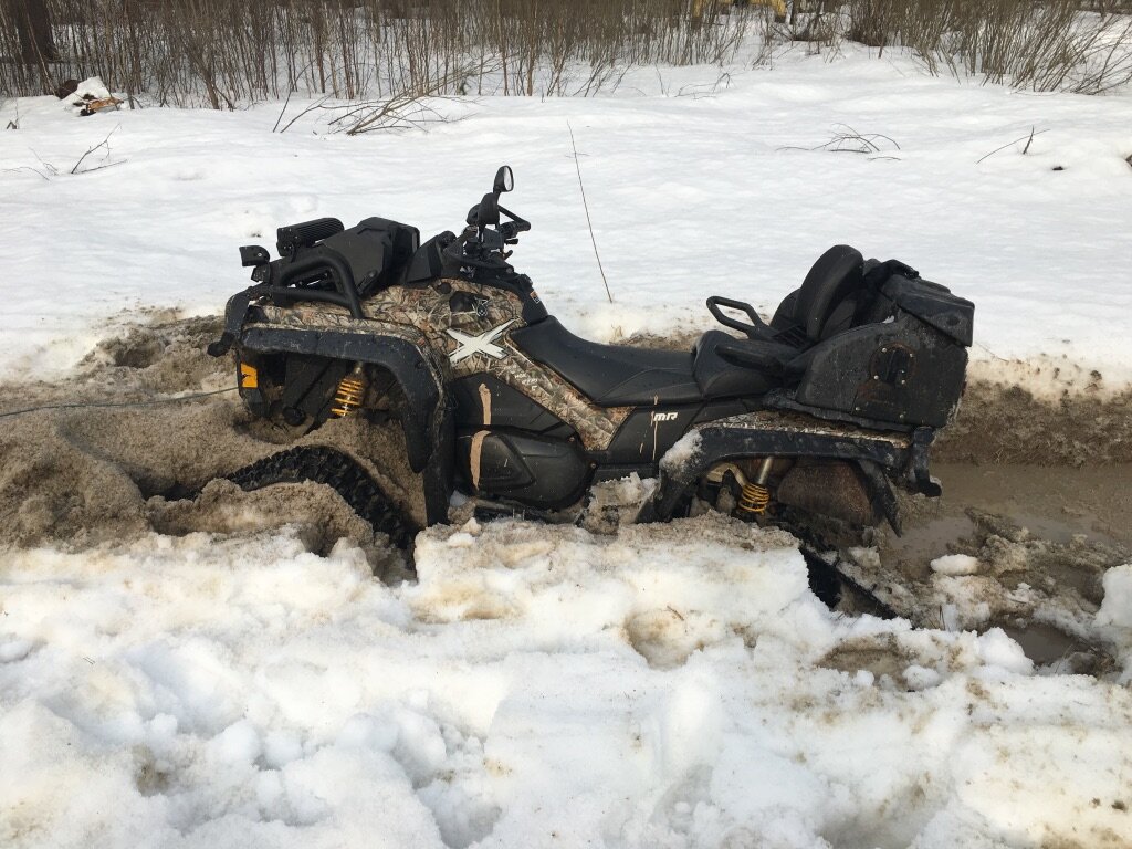 Безобидная грязь, которую квадроцикл на колесах проедет играючи, остановила могучий XMR 1000. После небольшой пробуксовки слез с катков задний левый трак. Дальше была долгая и интересная операция по вызволению "хмыря" из грязи и ремонт гусеницы...