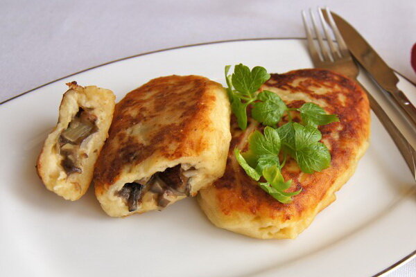 Картофельные зразы можно готовить с совершенно разной начинкой. Готовятся они очень быстро и легко и получаются очень вкусными. Ингредиенты: 1. Картофель - 6 шт. 2. Куриное яйцо - 1 шт. 3. Сливочное масло - 30 гр. 4. Мука - 3-4 ст. ложки и 1 стакан для панировки. 5. Соль, перец - по вкусу. Способ приготовления: 1. Картофель почистить и отварить. Обязательно картофель при варки солим и перчим. Сливаем с картофеля воду и даем полностью остыть. Измельчаем через мясорубку или толкушкой (комков быть не должно). Как только картофель стал как пюре, добавляем в него куриное яйцо и сливочное масло. Ещё раз следует потолочь. Добавляем 3-4 ст. ложки муки и хорошенько перемешать (должно получиться тесто по структуре). 2. Начинку можно использовать самую разную. Это может быть и мясо и грибы и капуста. Сегодня у меня начинка жаренные шампиньоны с луком. 3. Присыпаем мукой доску на которой будем лепить зразы. Берем столовой ложкой небольшое количество картофельного теста. Руки должны быть слег