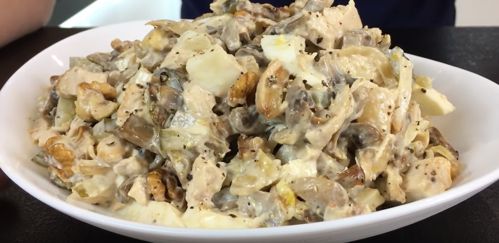 Куриная грудка - 1 штука Шампиньоны - 700 грамм Лук - 1 штука Грецкие орехи - 70 грамм Маринованные огурцы - 2 штуки (или свежие) Яйца вареные - 3 штуки Майонез, перец - по вкусу Куриное филе отбить, посолить. Отправить на сковороду. Готовить до румяного цвета с двух сторон. Затем, нарезать тонкой соломкой. Можно так же использовать отварную курицу, которая осталась, например, от супа. Ее так же следует обжарить на масле. Орехи просушить на сковороде. Достаточно крупно нарубить ножом. Шампиньоны и лук нарезаются небольшими кубиками. Обжариваются до готовности. Огурцы лучше взять маринованные. Но свежие тоже подойдут. Нарезаются соломкой. Яйца измельчить в мелкий кубик. Смиксовать все продукты. Заправить майонезом и посыпать перцем.