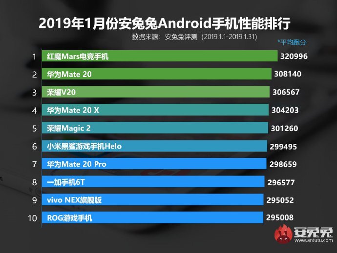 AnTuTu опубликовали список десяти лучших телефонов Android на основе их производительности - на этот раз за январь 2019 года. В списке появилось несколько новых смартфонов, но первые три устройства остались без изменений по сравнению с прошлым месяцем. ТОП НА САЙТЕ Nubia Red Magic Марс находится на вершине топа, набрав 320,996 очков, обогнав Huawei Mate 20, которая находится на втором месте. Honor V20 с набором микросхем Kirin 980 закрывает первую тройку с 306 567 очками. Компания Huawei снова занимает четвертое место с Mate 20 X, а его суббренд – пятое место с Honor Magic 2. Ещё один игровой телефон попал в список, и это Black Shark Helo. Далее смартфон Mate 20 Pro следует под номером семь, опустившись на 2 позиции, по сравнению с прошлым месяцем. OnePlus 6T сохраняет свою позицию на 8 месте. Два новых смартфона в ТОП-10 находятся под номерами 9 и 10 - это Vivo NEX и ASUS ROG. Оба телефона работают на процессоре Snapdragon 845.