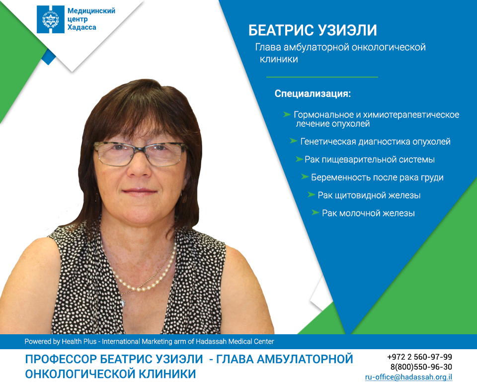 Профессор Беатрис Узиели более пятнадцати лет занимает должность руководителя дневного стационара ведущего онкологического института имени Моше Шарета при «Хадассе». Профессор Узиели является известным маммологом-онкологом, получившим международное признание. За свой вклад в науку и медицину Беатрис Узиели была удостоена престижной премии Ландау. Используя индивидуальный подход Беатрис Узиели помогает пациентам “Хадассы” в следующих направлениях: Профессор Беатрис Узиели - автор многих научных статей и публикаций, посвященных механизмам распространения и метастазирования, связи между различными белками и агрессивностью опухолей, а также развитию новых методов лечения. На свои исследовательские работы в области изучения онкологических заболеваний молочной железы и простаты Беатрис Узиели получила 11 грантов. Профессор Узиэли — член Американского, Израильского и Европейского сообществ Клинической онкологии, член Европейского сообщества Медицинской онкологии. Записаться на консультаци