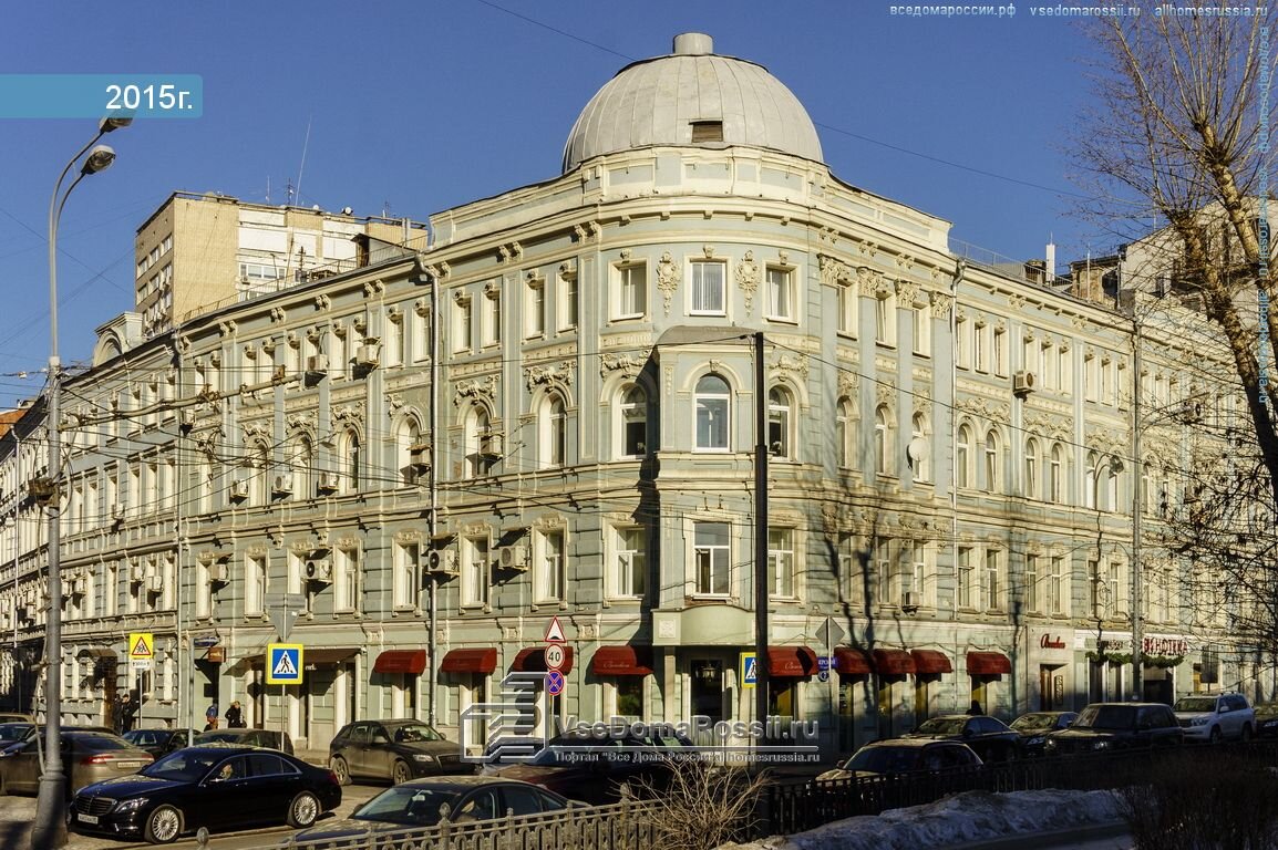 Голубой дом на углу Тверского Бульвара и Малой Бронной (2/7). Он и сейчас красавец. На Тверском бульваре, прямо напротив него, огромный куст сирени. Когда она цветет и вид не загромождает очередная «инсталляция», я по дороге обязательно присаживаюсь на скамейку напротив и смотрю на них: сирень и мой дом.