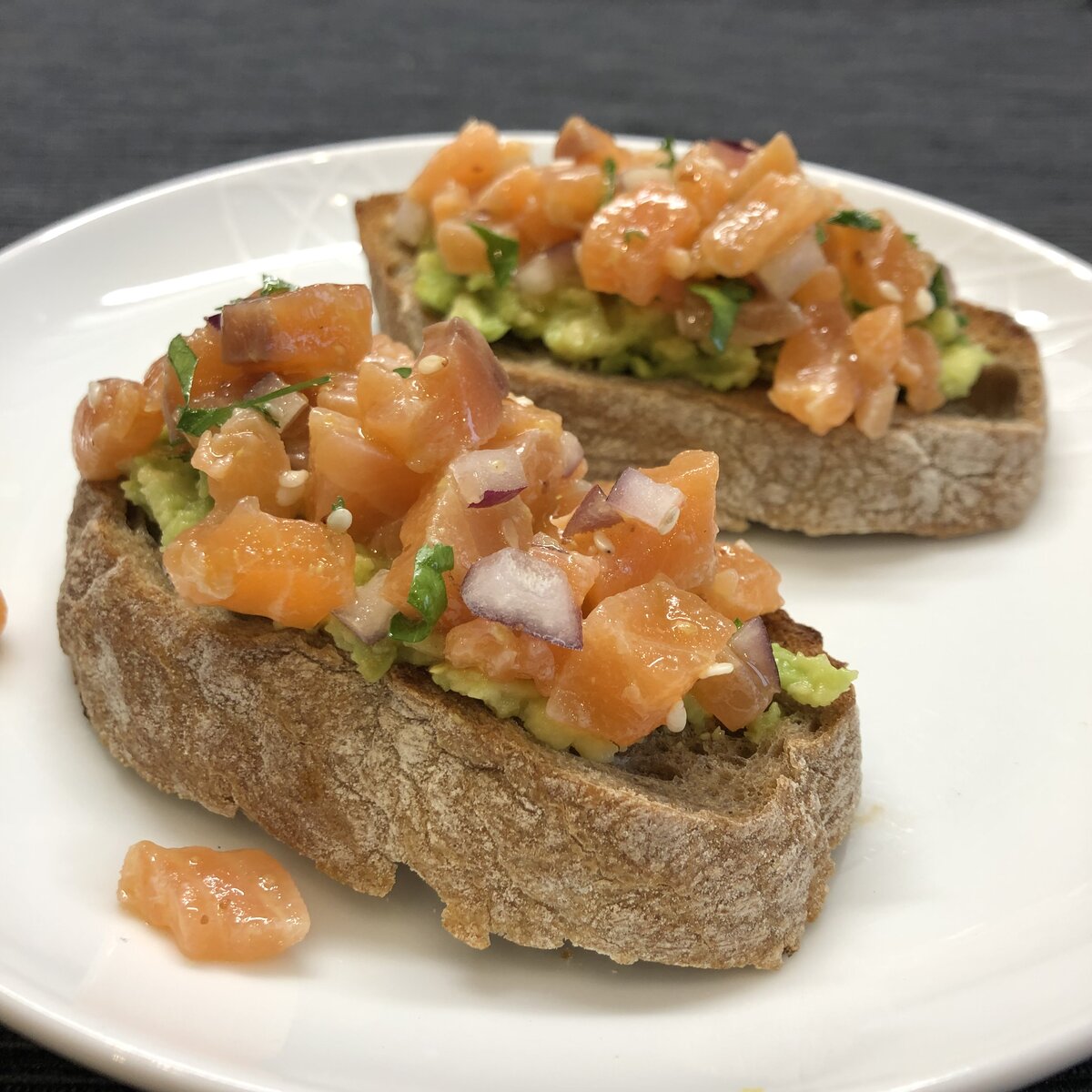 Разомните вилкой авокадо. Намажьте авокадо на хлеб, сверху выложите рыбу. Количество соевого соуса, сока лимона, оливкового масла, петрушки, горчицы и кунжута можете менять на свой вкус. Для тартара также хорошо подойдёт форель, кижуч, нерка.