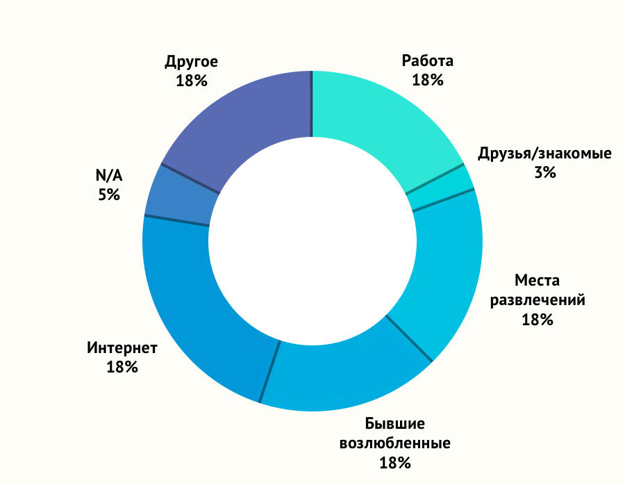 Участников опроса также попросили сказать, где они знакомились со своим любовниками и любовницами. Диаграмма показывает, что часто изменники ищут новую пассию на работе, социальных мероприятиях или в развлекательных местах. Также очень популярны знакомства в интернете. Многие респонденты не ищут новых контактов, поскольку чаще изменяют с бывшими возлюбленными.