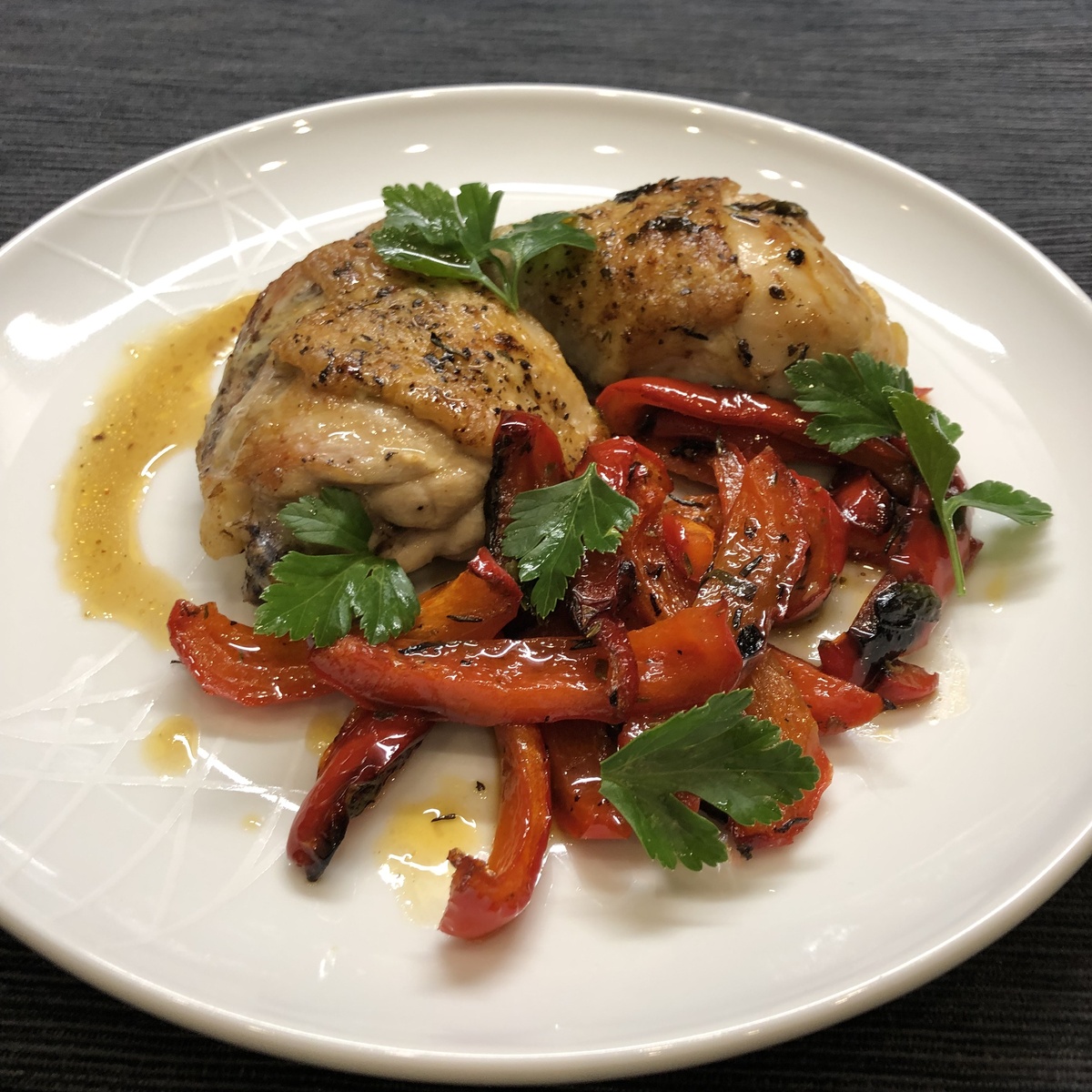 Разогрейте на сковороде масло, обжарьте курицу до золотистой корочки (около 2 минут с каждой стороны). Переложите курицу в форму для запекания. Нарежьте болгарский перец полосками, перемешайте с орегано, тимьяном и петрушкой (мелко нарезанной), обжарьте на той же сковороде (около 5 минут). Переложите перец в форму к курице. Готовьте в разогретой до 180 гр духовке 20 минут. В качестве быстрого гарнира можете приготовить кускус (посолить, залить кипятком и накрыть на пару минут крышкой). Для обжарки можете использовать любое рафинированное масло - оливковое, подсолнечное, виноградное, рисовое. Я жарю на виноградном.