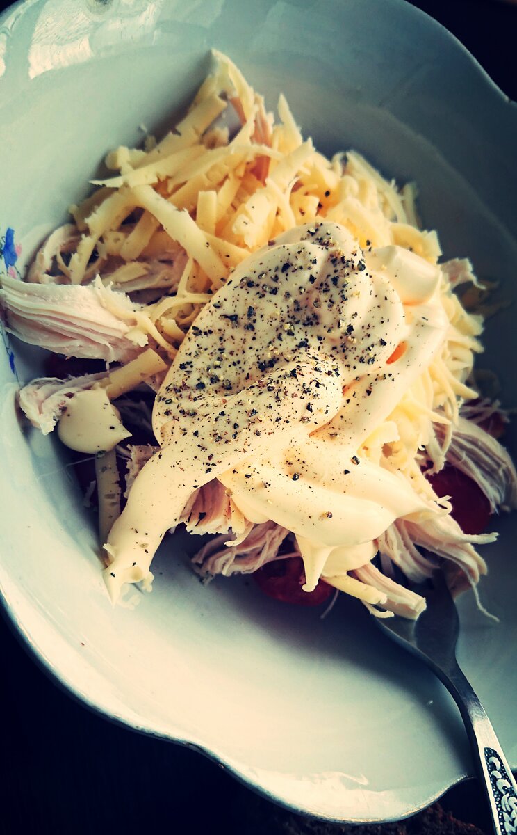 Недолго думая, я натерла остатки сыра на крупной тёрке. Нащипала отварной курицы, добавила черри, разрезаные на четвертушки. Тщательно перемешала полученную смесь. И вспомнила рецепт своего любимого салата, но о нем расскажу в конце.