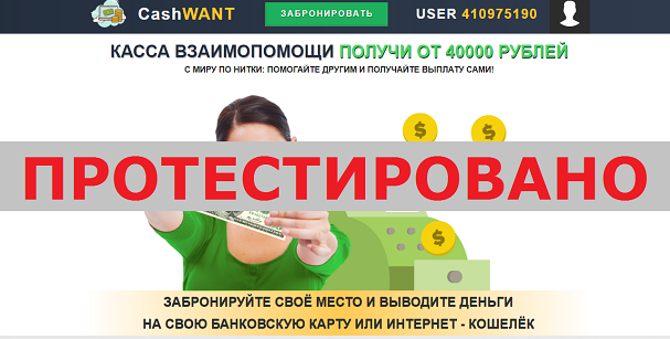 Касса взаимопомощи CashWant располагается по адресу: cash-want.ru.com/user410975190. Принадлежит данный сайт компании ООО «Сообщество Взаимопомощи». Нам предлагают забронировать свое место и просто выводить деньги. Принцип работы сервиса: деньги переводятся к нам от случайных пользователей, участников программы. Деньги якобы поступят на наш счет в качестве финансовой взаимопомощи. Аналогичные мошеннические проекты: CashLine и CashBoxs. В процессе тестирования мы узнали, каковы наши шансы получить здесь хоть что-то. Сайт CashWant правда помогает каждому и выводит деньги на наш счет? Тематика сайта очень похвальна. Но существуют ли подобные реально работающие сервисы. Пока нам не доводилось встретить хоть один. В данном случае, нас уверяют, что стоит помочь один раз самому, и сразу же найдутся те, кто окажет большую помощь нам. Нам предлагают забронировать место в системе.