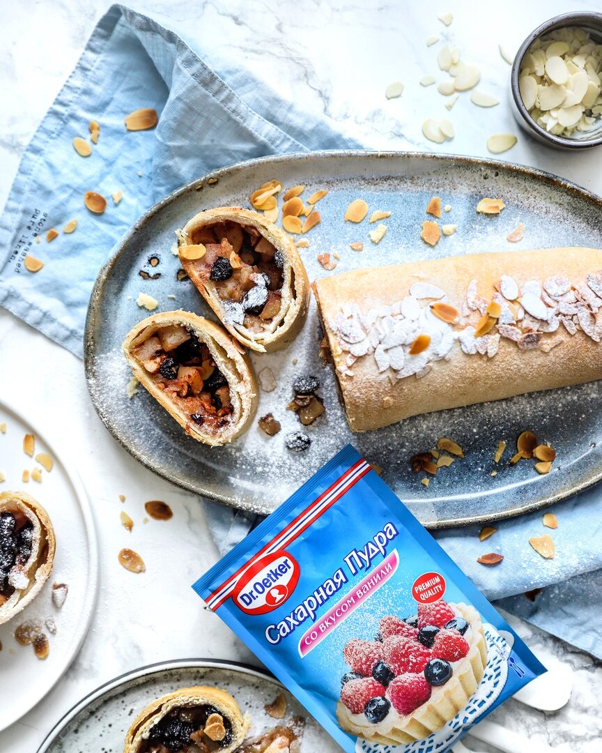 Лакомым угощением точно может стать всеми любимый штрудель с яблоками, изюмом и миндалём. 👉 Вам понадобится: Для теста: