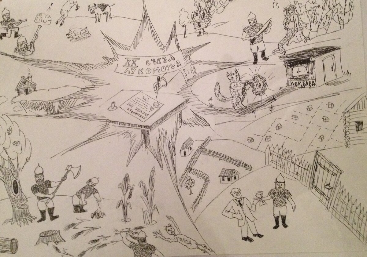 Метафорическое рисование: Сказки для взрослых «Лукоморья больше нет» Ироническое настроение текста передано через технику туши по белой бумаге пером наподобие комиксов. Стихотворение заинтересовало с той позиции, что, написав произведение о конкретном политическом деятеле Никите Сергеевиче Хрущёве, Высоцкий создал некоторую обобщённую сатирическую схему нашего русского правления, что создано, благодаря жанру фольклора. Кому интересна данная техника? Готов провести мастер класс.