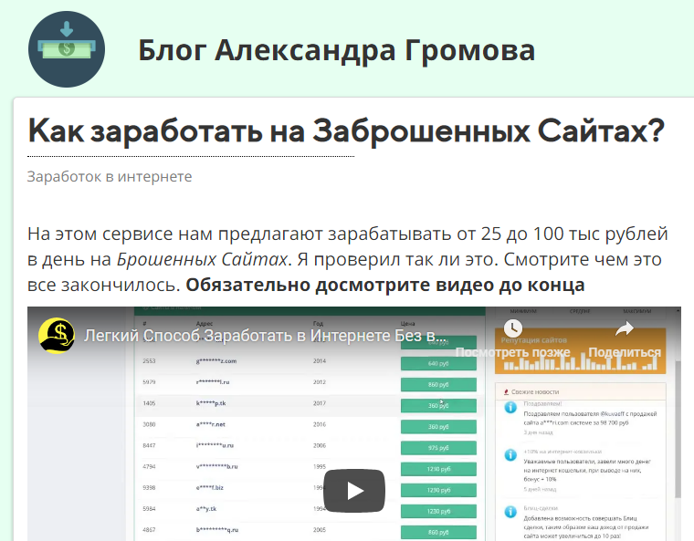 Вы знаете, как безошибочно определить охотников за Вашими деньгами? Если не уверены, прочитайте мою несложную инструкцию. Небольшое предисловие и пример Интернет - это не только колоссальное информационное пространство, но и идеальная питательная среда для разных "мутных личностей". А питаются они деньгами. Чужими деньгами, а возможно, что и Вашими. Как же "отделить зерна от плевел"? Ну вот, например, сегодняшний почтовый спам привел на такую вот страницу: Что нас должно здесь смутить? Первое, и самое простое: просто нереальная для рядового человека сумма заработка 25-100 т.р. в день! ЧТО? Некий г-н Громов нам за здорово живешь дает прямо в руки такую вот недоптицу, несущую золотые яички? Да ладно, шо, правда? Уже на этом моменте можно уходить с этого мегаресурса, и даже видео не начинать смотреть. Но если червь сомнения таки начал поедать нас, смотрим дальше. Что такое "Заброшенные Сайты" ? И самое главное, как на них заработать, перепродавая их? Элементарно, никак. Все дело в том, чт