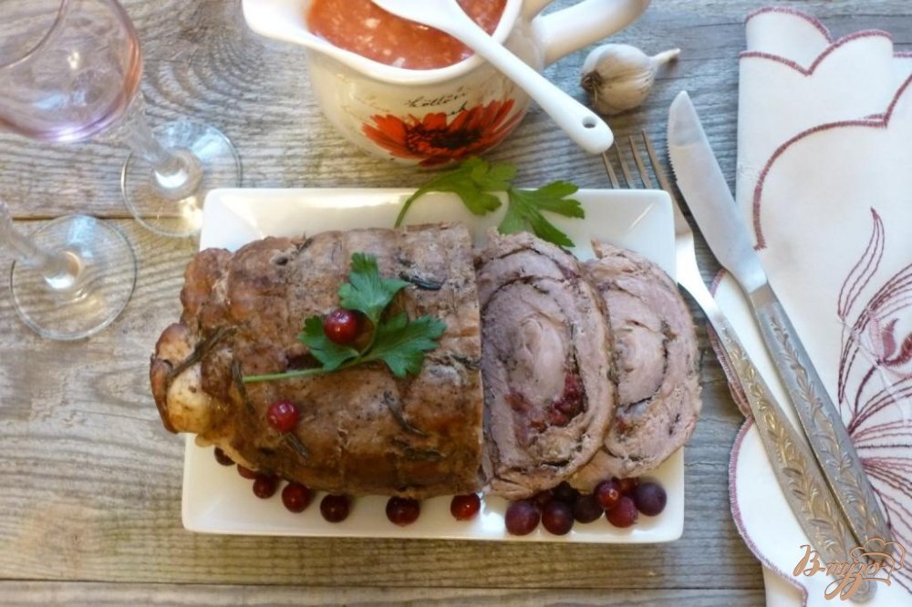 3. Мясо промыть, обсушить, удалить сухожилия, тщательно отбить. Смазать кусок мяса растительным маслом, посолить и поперчить с обеих сторон, на середину положить клюкву и лук, аккуратно свернуть в рулет и перевязать. Завернуть рулет в фольгу и готовить в разогретой до 220 С духовке в течении 1 часа.