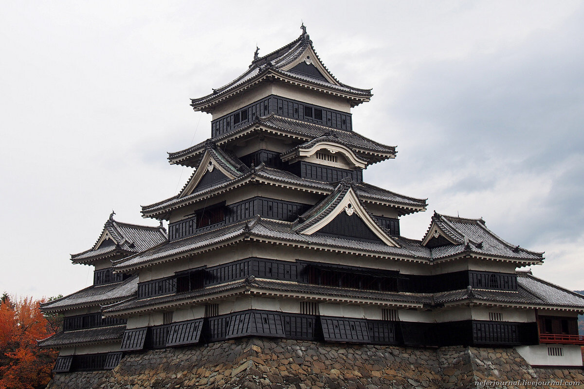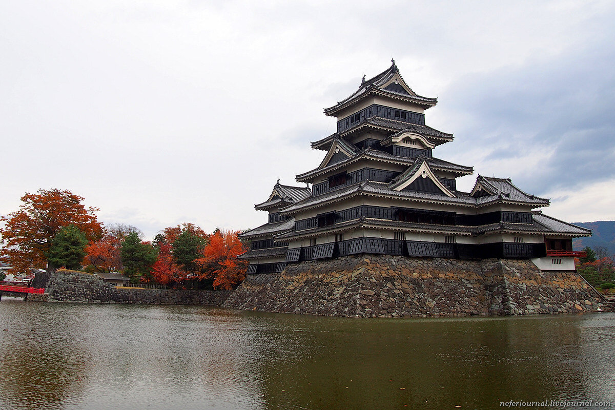 Замок Мацумото является равнинным замком - hirajiro. Он основан в 1504 году. Ныне существующее сооружение построено в 1593-1594 годах. Название "Черный ворон" замок получил за цвет стен и за маленькие башенки, напоминающие раскинутые крылья птицы.