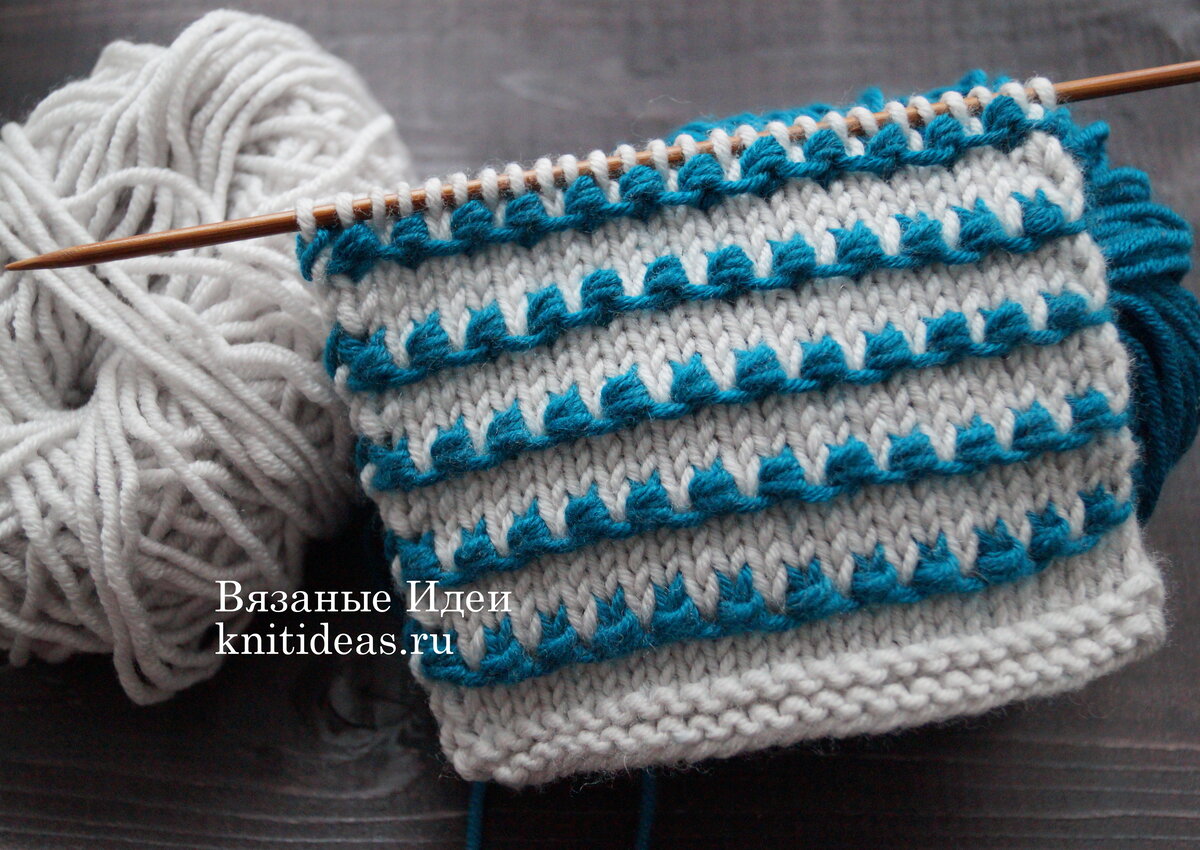 Если Вы вяжете детские вещи, обратите внимание на этот замечательный узор. Думаю, также здорово будут выглядеть подушки, связанные этим узором. На фоне лицевой глади располагаются горизонтальные дорожки другого цвета с узелками, которые соединяются перемычками. Посмотрите ниже описание и видео, как вязать 5 и 6 ряд узора, нажимайте на стрелочку справа и листайте. Если Вам понравился этот узор, поставьте, пожалуйста, лайк и не забудьте подписаться на наш канал, чтобы не пропустить следующие публикации! Желаем приятного творчества!