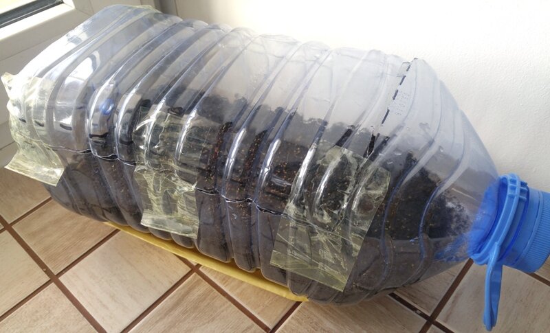 Такие теплички для посева семян из пластиковых бутылок можно считать одноразовыми, их не нужно хранить, так как в следующем году легко сделать новую тару для выращивания рассады.