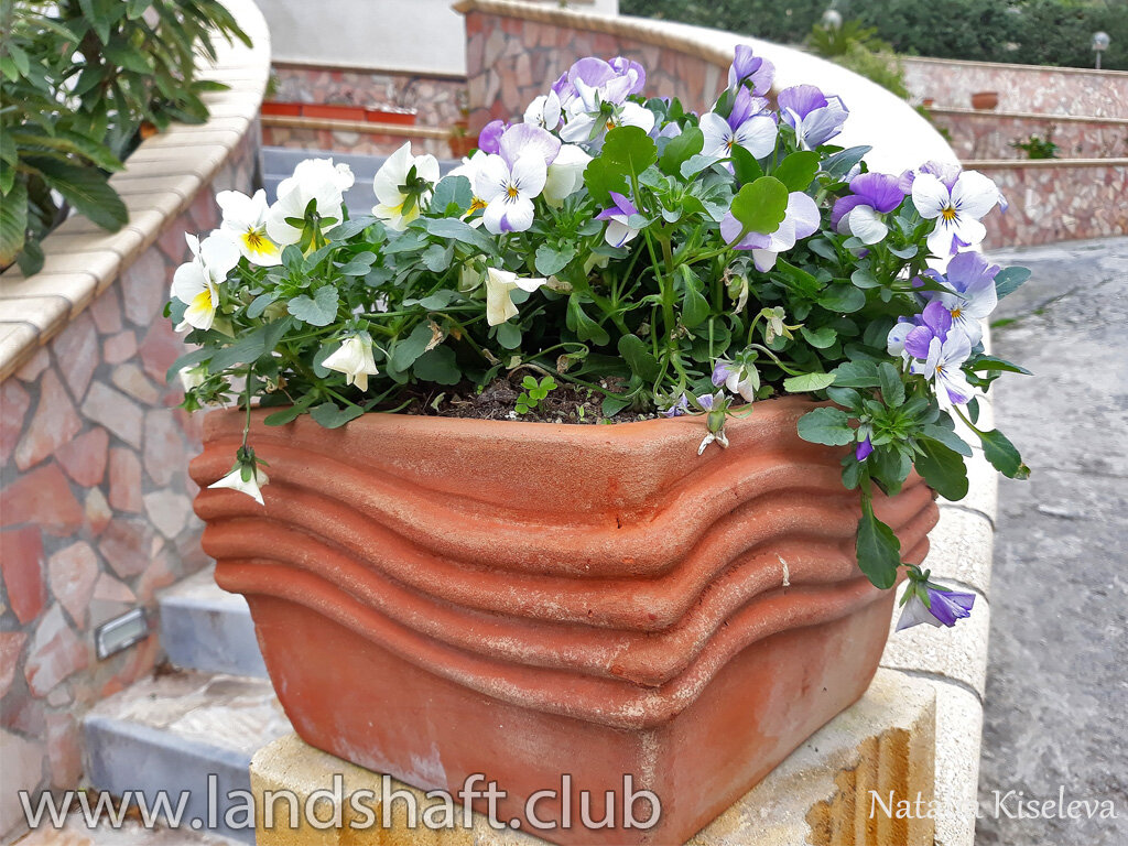 Это классические ёмкости. Толстые стенки не позволяют земле сильно перегреваться. Вода не застаивается у корней, так как влага испаряется через поры. Но ёмкости из керамики тяжёлые и хрупкие. К тому же они не морозостойки: зимой при резких перепадах температуры могут просто лопнуть. Со временем появляется солевой налёт.