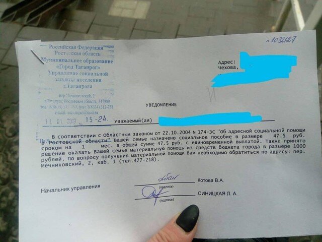 Глава управления делами Курманова Ростовской области 43-летний Марат Шурастов, рассказал журналистам, что скорее как издевка выглядит пособие, назначенное жительнице Таганрога – 47,5 рублей. - «Судя по ответу из администрации Таганрога в управление делами Курманова Ростовской области, из средств бюджета семью смогли поддержать единовременной помощью в 1000 рублей. А вот размер назначенного социального пособия, которое рассчитали исходя из требований областного закона, впечатлил своей „щедростью“ — 47,5 рубля с единовременной выплатой», — сообщило ростовское управление делами. По данным управления делами, за помощью сначала в местную администрацию 11 января 2019 года обращалась многодетная семья, в которой детей воспитывает один родитель, это мать. Она помощь получила, в 47 рублей. 20 января многодетная мать обратилась в приемную управления делами Курманова региона с заявлением-жалобой, за отказ ей в нормальной материальной поддержкой от властей города Решение о выделении сме