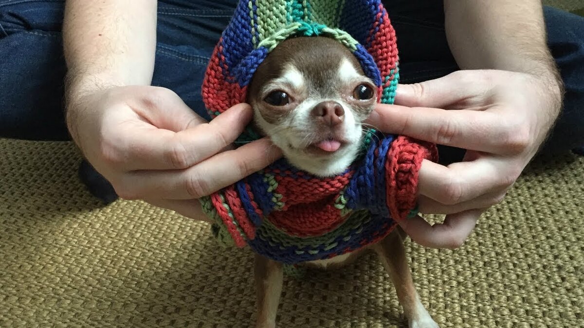 Самая спокойная в мире собака вновь примеряет новый наряд. На очереди вязаная кофта. Ручная работа для ручной собачки)