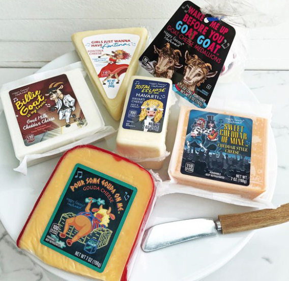 6 сортов сыра Happy Farms можно будет купить с 6 февраля. Любителям Guns N’ Roses придет по душе «Sweet Cheddar of Mine», а фанатам Def Leppard — «Pour Some Gouda on Me». На названия других сыров повлияли песни Синди Лаупер («Girls Just Wanna Have Fontina»), Майкла Джексона («Billie Goat Is My Lover»), Бонни Тайлер («Total Eclipse of the Havart») и Wham! («Wake Me Up Before You Goat-Goat»). На упаковке изображены сами музыканты и группы в виде животных (коров, быков и козлов).