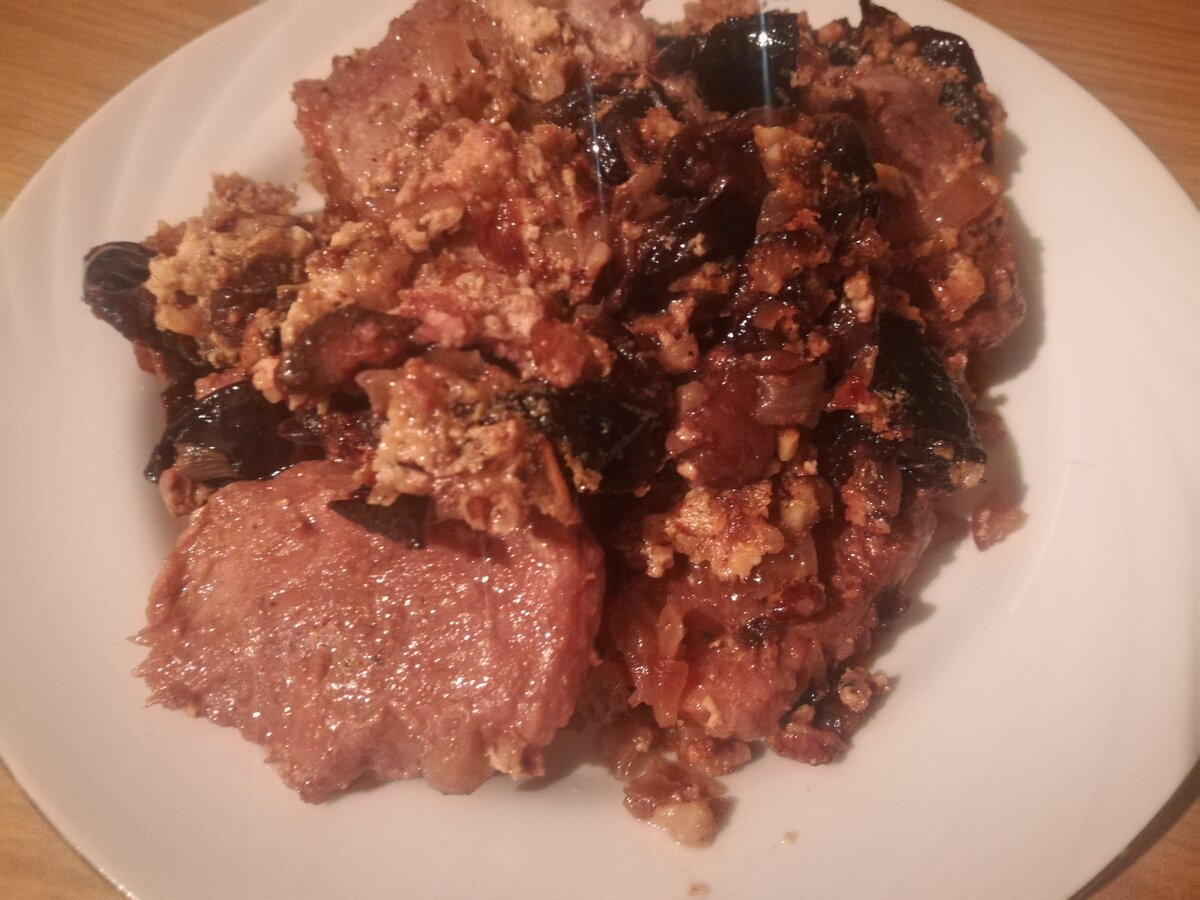 Мясное блюдо которое готовится в духовке с добавление чернослива и сливок. Сливки придают мясу сочность и нежность, а чернослив необычный вкус. Просто в приготовлении и не занимает много времени. Для приготовления потребуется: Мясо свинина - 700 гр. Чернослив - 200 гр. Орехи - 200 гр. Лук средний - 8 шт. Сливочное масло - 2 ст. л. Сливки - 1 стакан Соль, перец - по вкусу Пошаговый способ приготовления: Свинину режем на небольшие отбивные. Хорошо их отбиваем. Солим, перчим их по вкусу и оставляем примерно на 15 минут. Чернослив заливаем теплой водой и оставляем на 15 минут. Мелко нарезаем лук и обжариваем его на сковороде на сливочном масле (1 ст. л.) до полуготовности и отставляем в сторону. На другой сковороде жарим отбивные тоже до полуготовности. Пока отбивные жарятся хорошо промываем чернослив и режем его на небольшие кусочки. Обжаренные отбивные выкладываем на глубокий противень Посыпаем сверху нарезанным черносливом и поджаренным луком Теперь необходимо приготовить соус для зал