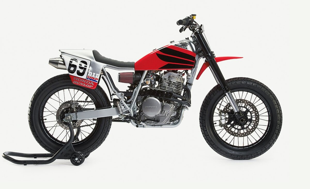 Мотоцикл Honda XR650L оказался прекрасным выбором. Он прямой родственник покорителя пустыни Honda XR650R, производит достаточно мощности и не стоит целое состояние. К тому же к нему без проблем можно купить разнообразные запчасти. Только если вы не собираетесь построить флет-трекер.