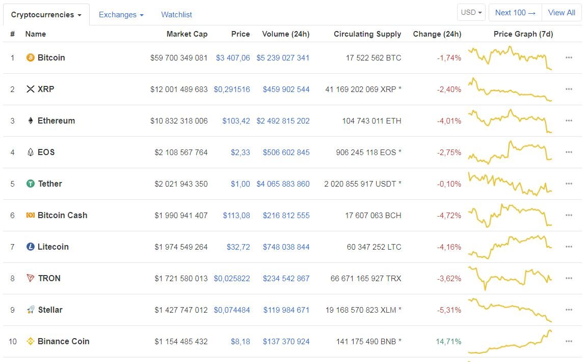 Во время общего падения криптовалютного рынка криптовалюте Binance Coin удалось занять 10 позицию в рейтинге ТОП-10 криптовалют по размеру рыночной капитализации, вытеснив Bitcoin SV.
