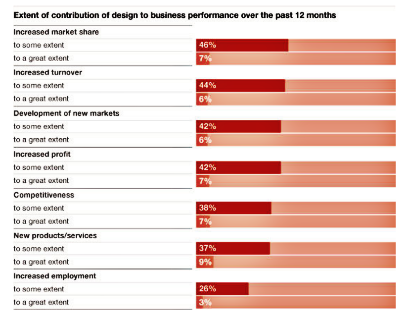 В 2003 году Национальное агентство Дании по предпринимательству и компаниям опубликовало отчёт об исследовании «Экономический эффект дизайна». Они обзвонили тысячу датских частных компаний, в которых работает 10 и более человек. Спрашивали про объёмы инвестиций в дизайн и показатели валового дохода.