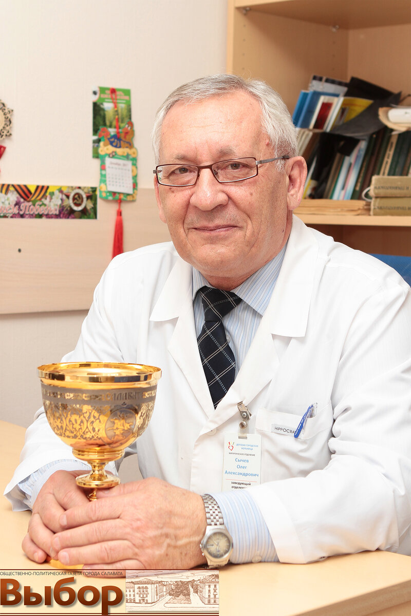Олег Александрович Сычёв — заведующий хирургическим отделением детской больницы, врач — детский хирург. Родился в с. Архангельском Архангельского района БАССР в 1949 году. Потомственный врач, мать и отец — врачи, 10 лет работавшие в Салавате, затем — в Уфе. В 1972 году окончил Башкирский государственный медицинский институт. В 1972-73 годах прошел интернатуру по детской хирургии в Республиканской детской клинической больнице Уфы. С 1973 года работал детским хирургом в хирургическом отделении медсанчасти СМЗ города Салавата. С мая 1980 года и по сегодняшний день работает заведующим хирургического отделения детской больницы Салавата. В 2001 году Олегу Сычёву присвоено звание «Отличник здравоохранения Республики Башкортостан».