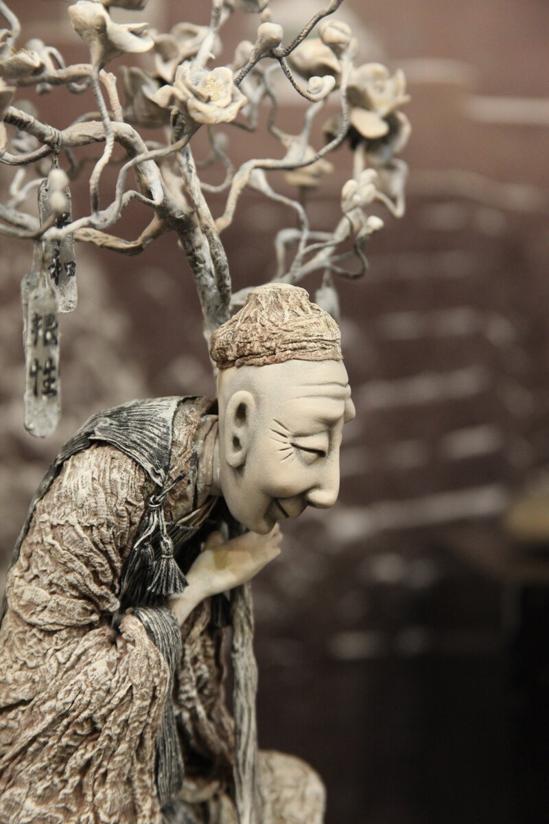 На нашей выставке есть авторская кукла Надежды Соколовой «Басё». Однотонная, в серых тонах фигура одинокого поэта, сидящего под цветущим деревом, к веткам которого привязаны дощечки с трехстишиями. Мацуо Басё – японский поэт, живший в 17 веке, один из любимейших японцами поэтов не только благодаря своим произведениям, но и особой харизме. В юности он сам смело определил свою судьбу, решив стать поэтом, и всю жизнь жил в бедности, вне мирской суеты, как монах, при этом монахом не был. Не имел своего дома, однако жилища его друзей и учеников всегда были открыты для него, Мечтал умереть в путешествии, что и сделал – как хотел! Всего 50 лет жизни, но какой жизни!
