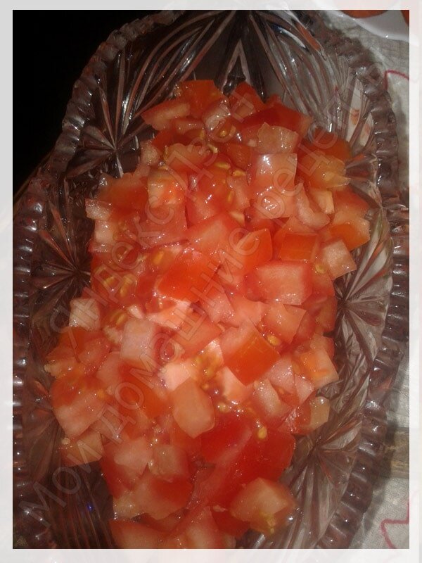 Очень вкусный и интересный слоеный салат, который можно приготовить на праздничный стол или просто побаловать себя и своих близких. Красиво и ярко выглядит такой салат, если приготовить его в разъемной форме. Я готовила в обычной керамической прямоугольной форме. Ингредиенты: Шаг 1. Помидоры режем кубиками и кладем в миску. Шаг 2. Зелень мелко рубим, чеснок трем на терке. Шаг 3. В нарезанные помидоры добавляем зелень и чеснок, солим, перчим и перемешиваем. Убираем в сторонку на 15-20 минут промариноваться. Пока помидоры маринуются нарезаем кубиками крабовые палочки. Сыр трем на мелкой терке. Шаг 4. С помидор сливаем сок, слегка их отжимаем и выкладываем в форму первым слоем. Шаг 5. Смазываем майонезом. Шаг 6. С кукурузы сливаем сок и выкладываем вторым слоем. Шаг 7. Слегка смазываем майонезом. Шаг 8. Следующий слой - крабовые палочки. Шаг 9. Этот слой смазываем майонезом побольше. Шаг 10. Теперь выкладываем слой сыра. Шаг 11. Хорошо смазываем майонезом. Шаг 12. Сверху посы